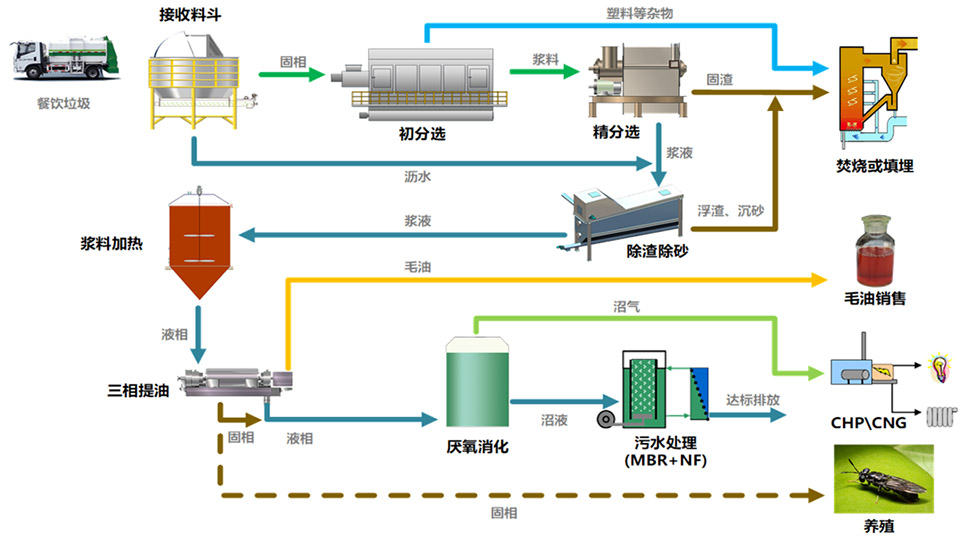 餐廚垃圾經(jīng)過機(jī)械分選、加熱分離、提油處理,形成有機(jī)漿液、毛油、有機(jī)物渣、固相雜物等。有機(jī)漿液通過厭氧消化產(chǎn)生沼氣,可用于熱電聯(lián)產(chǎn)或制成壓縮天然氣銷售;毛油純度>97%,可作為工業(yè)原料、生物柴油原料銷售;高品質(zhì)有機(jī)固渣可用于養(yǎng)殖;其它固渣可通過填埋或焚燒處理。